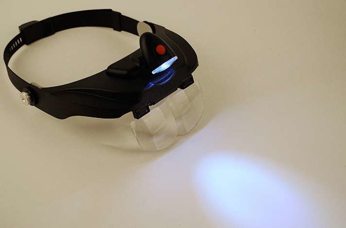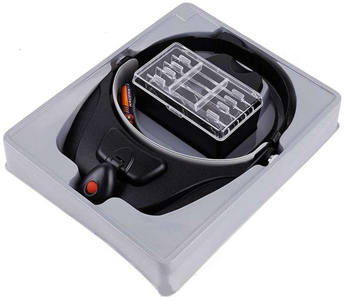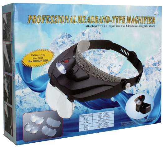 Nagłowna lupa dla elektroników, jubilerów i osób zajmujących się innymi pracami precyzyjnymi. Wyposażona w kierunkowe podświetlenie diodowe. W komplecie znajdują się 4 wymienne soczewki o różnej mocy od x1.2 do x3.5.