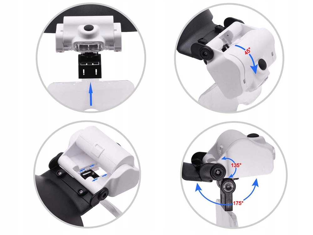 Diody LED można regulować kątem pochylenia w zależności od potrzeb. Cały mechanizm jest oparty w formie daszka na głowie. Można odchylać daszek w górę lub w dół. Lupa jest o rozmiarze uniwersalnym, ponieważ posiada pasek w pełni regulowany pokrętłem. Umożliwia pracę przy jednoczesnym używaniu okularów korekcyjnych.